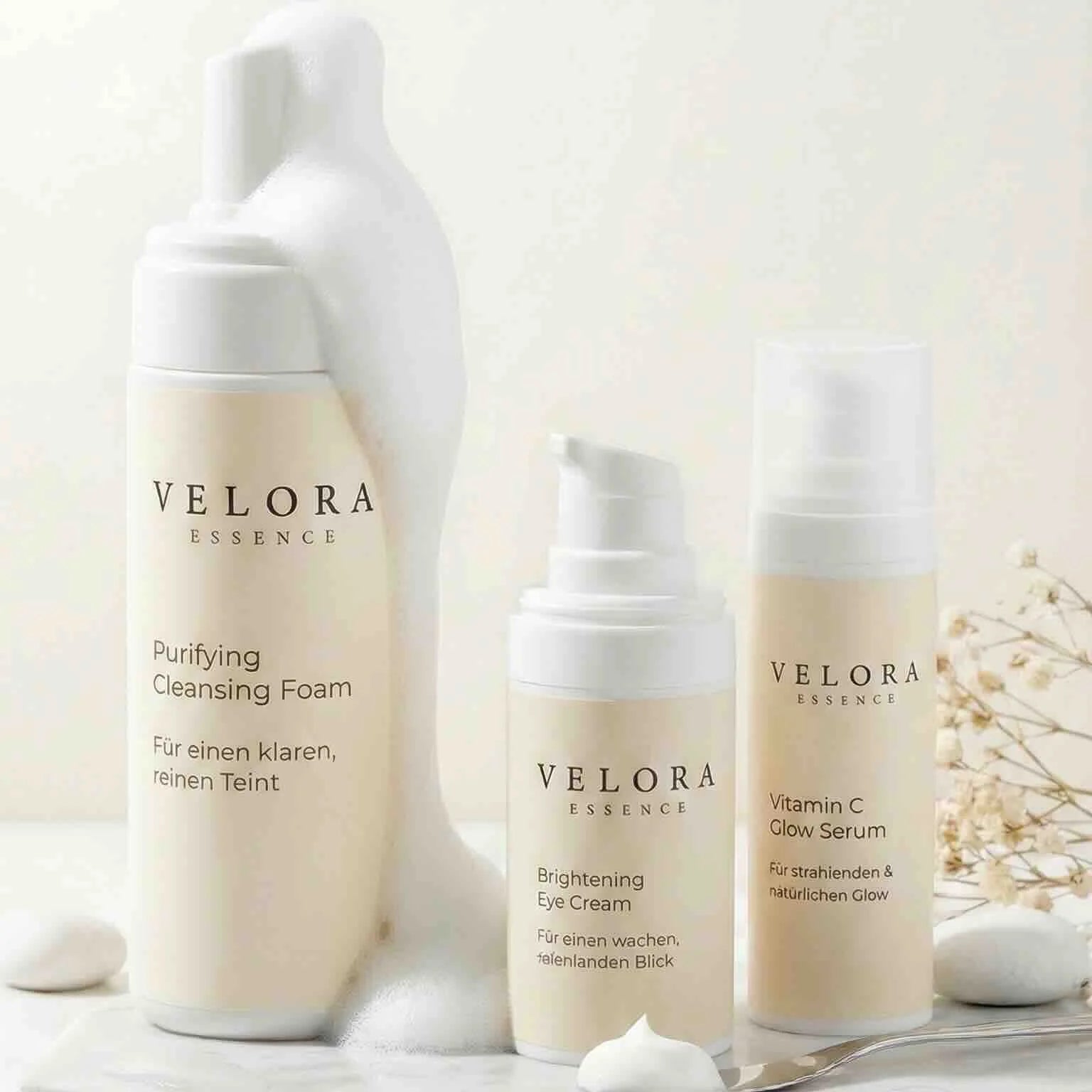 Answer: The Glow Booster Set is designed as a perfectly coordinated skincare routine. The Purifying Cleansing Foam optimally prepares the skin, the Vitamin C Serum supports radiant, even skin, and the Brightening Eye Cream completes the skincare routine for a fresh, awake look.